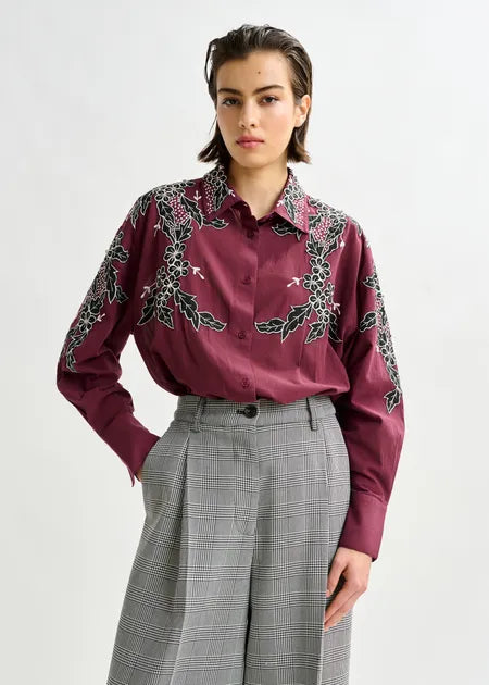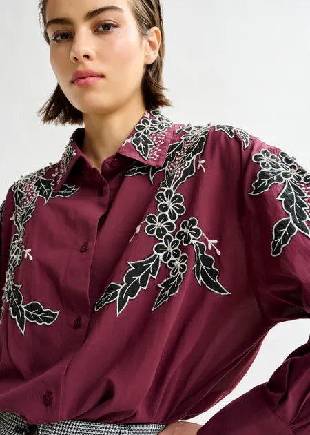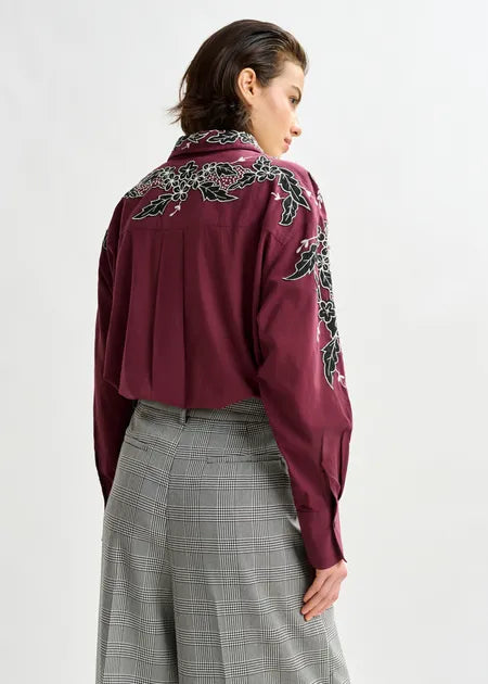 Besticktes Baumwollhemd in Burgunderrot, Weiß und Schwarz mit Strassverzierungen