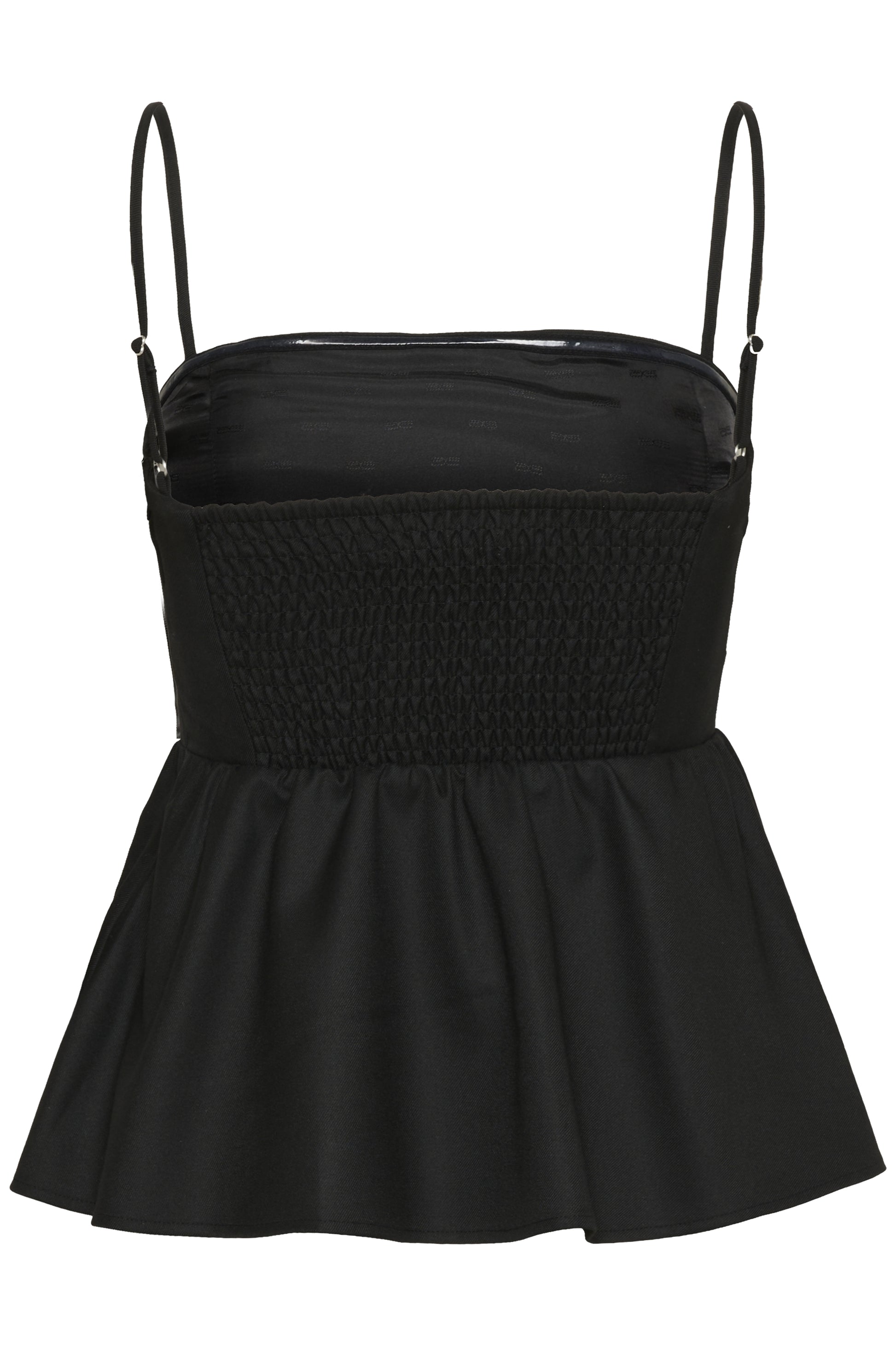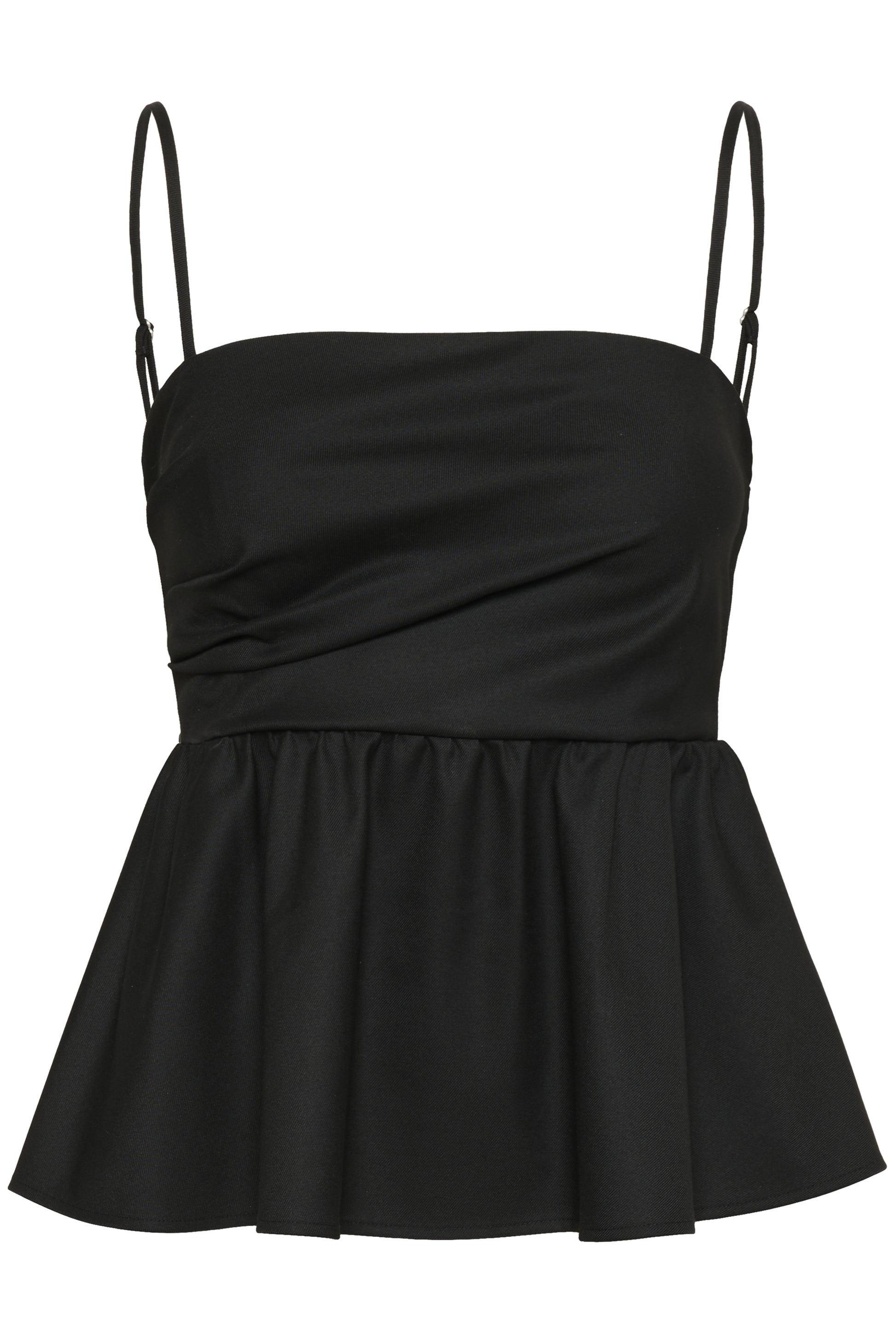 Schwarze Corsage mit Spaghetti-Trägern, fester Stoff wunderschön gerafftes Schösschen