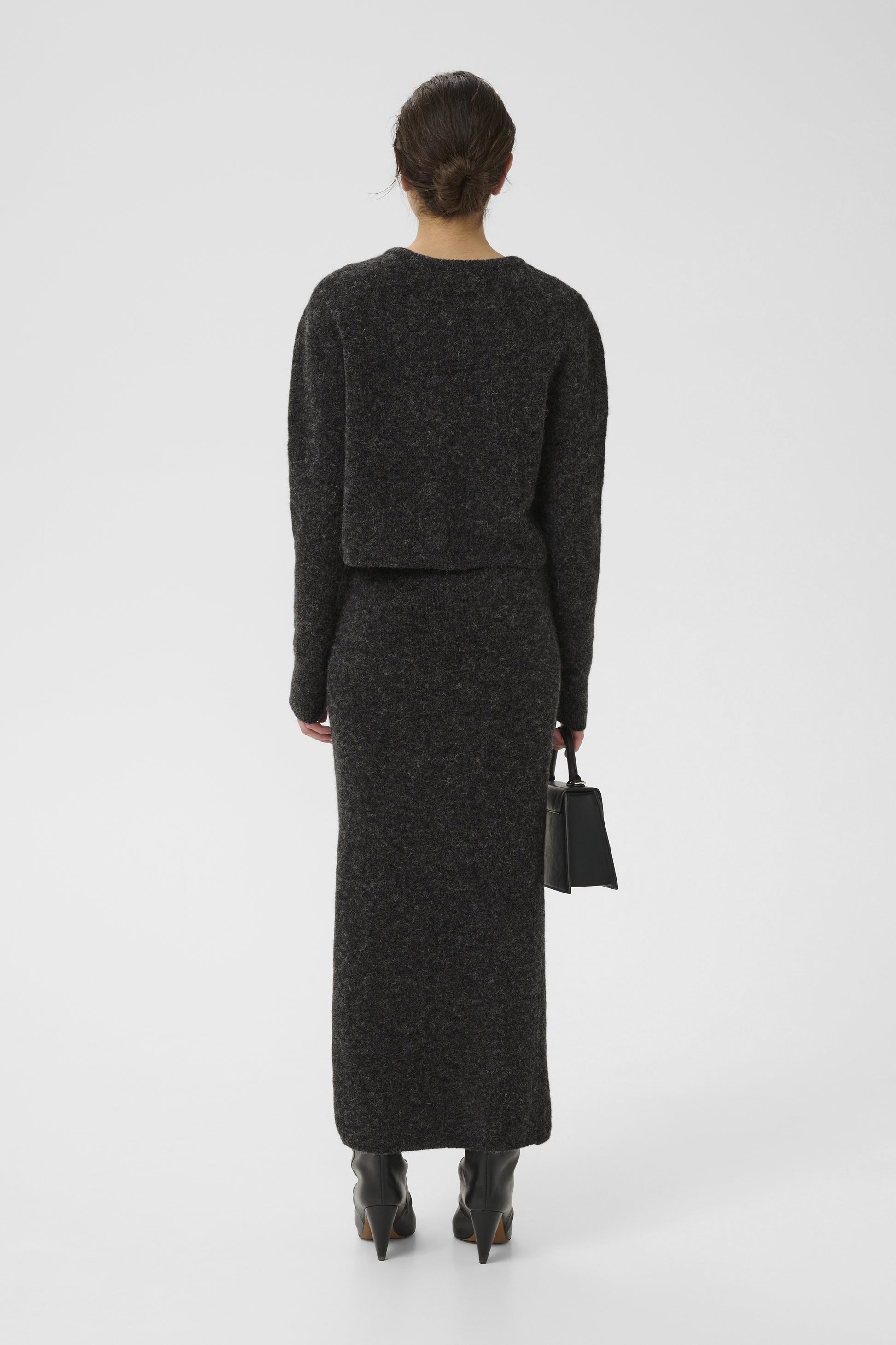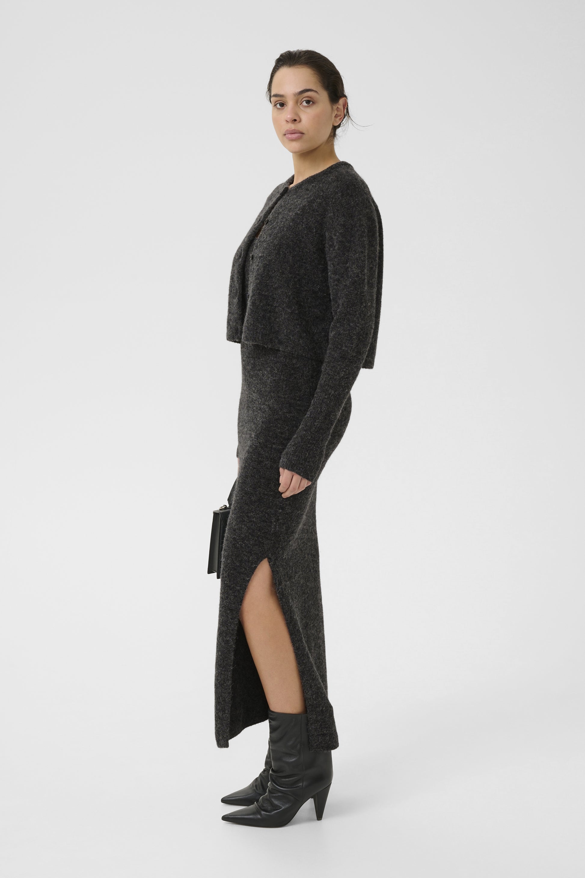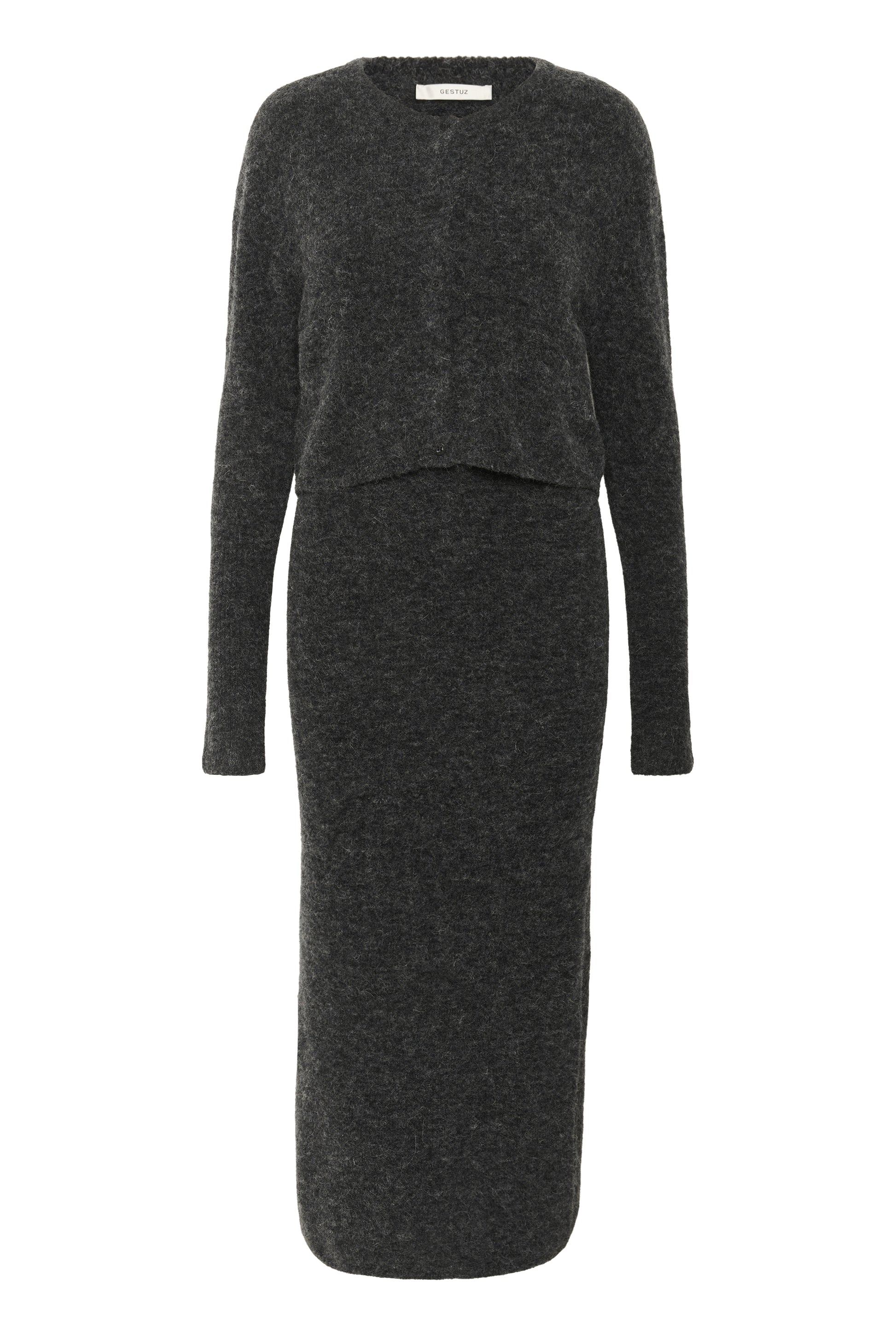 2-in-1-Kleid aus weichem Strick von Gestuz. Bestehend aus einem ärmellosen, figurbetonten Midikleid mit Seitenschlitz sowie einem kurzen Cardigan mit langen Ärmeln. Zusammen oder separat tragbar. Das Model ist 175 cm groß und trägt Größe S/36.