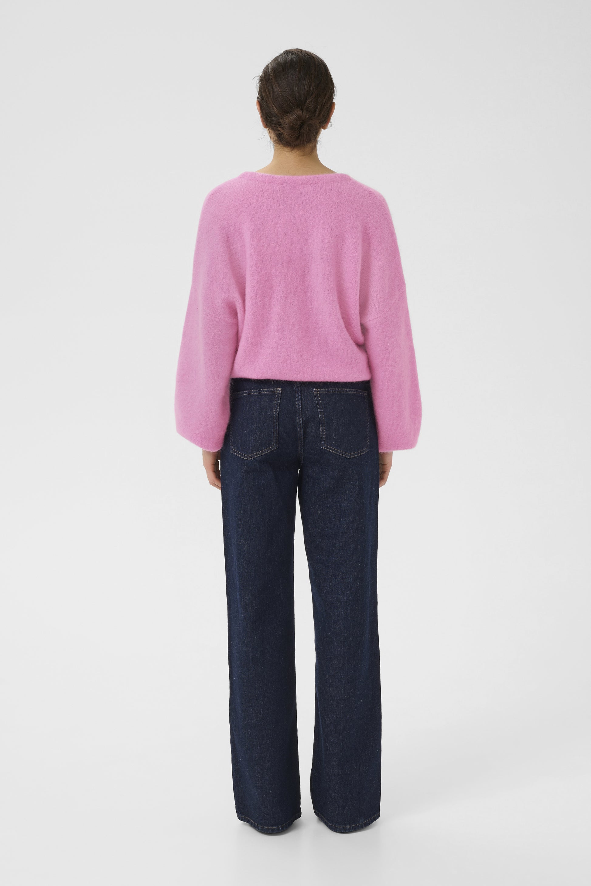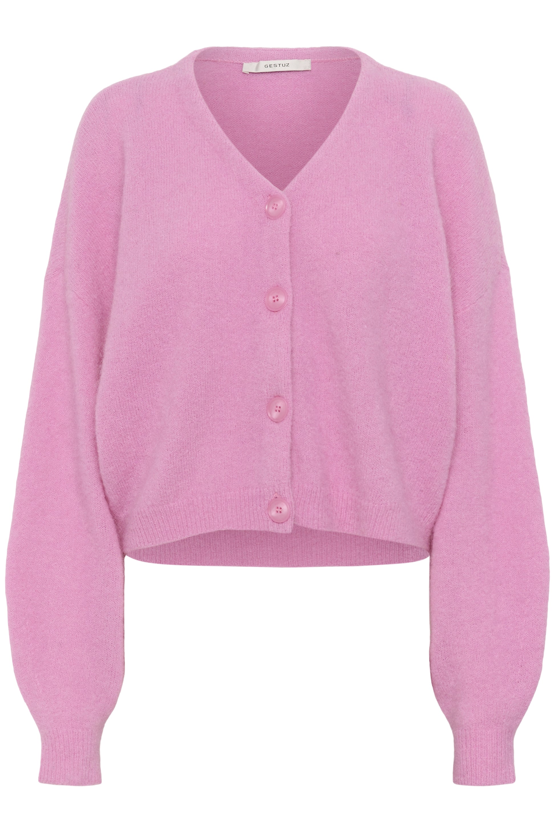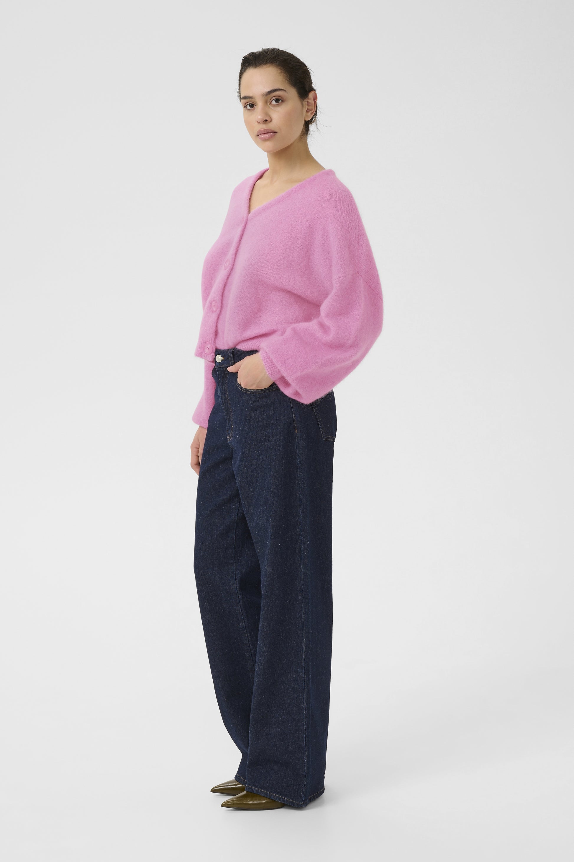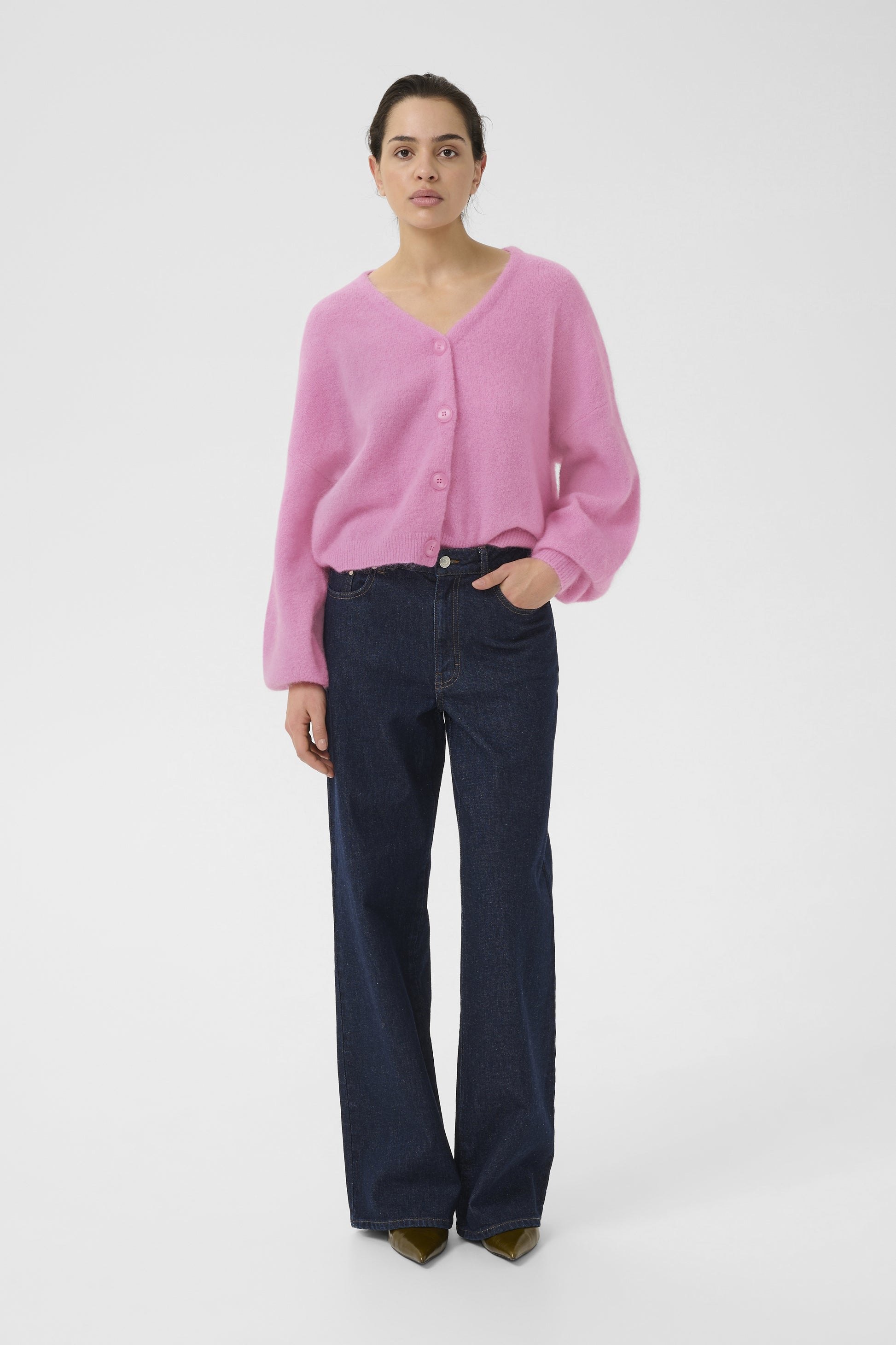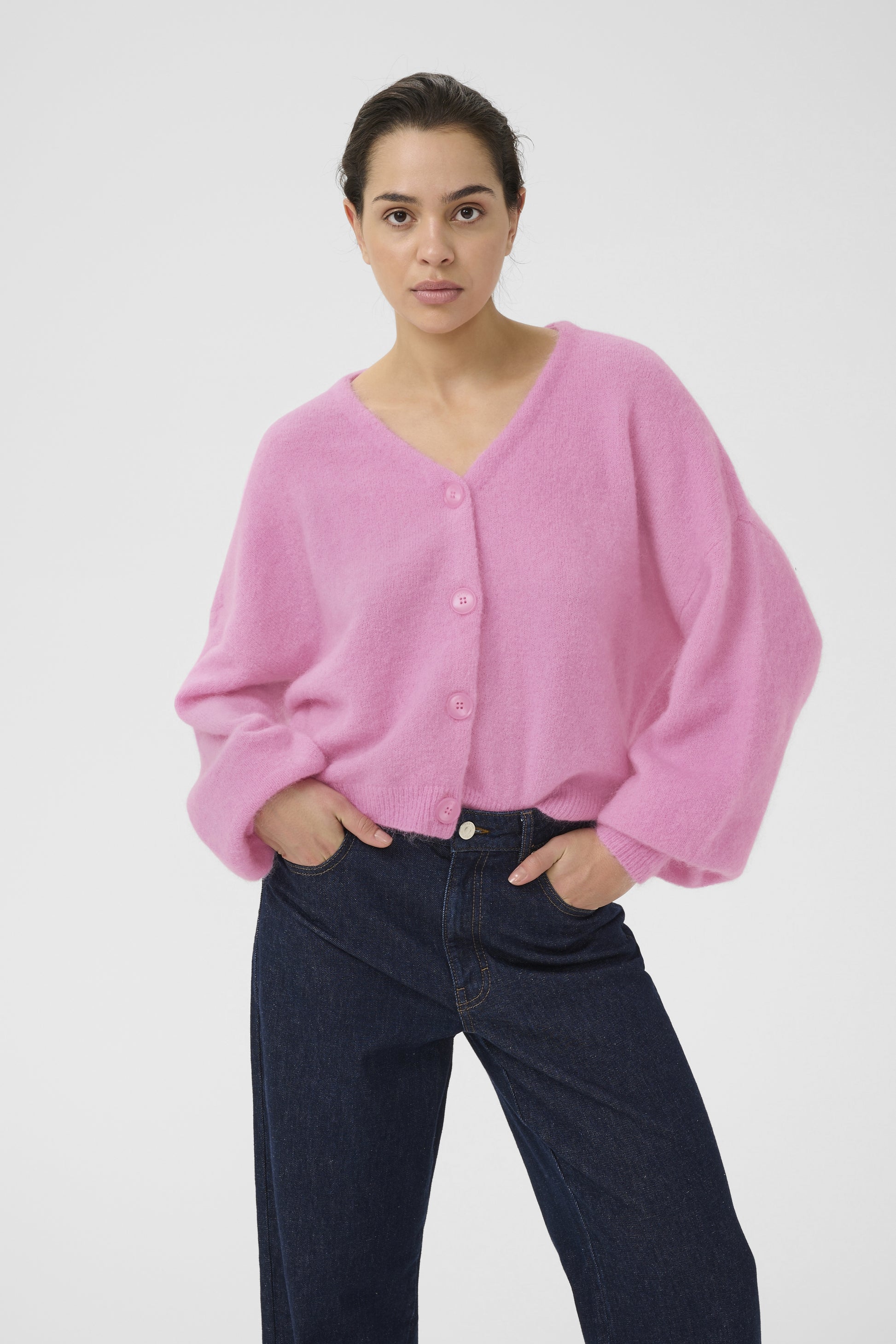 Weiche Strickjacke mit V-Ausschnitt und Knopfverschluss. Das Design hat eine kurze Passform mit Rippkanten an Ärmeln und Saum. Das Model ist 175 cm groß und trägt Größe S/36.