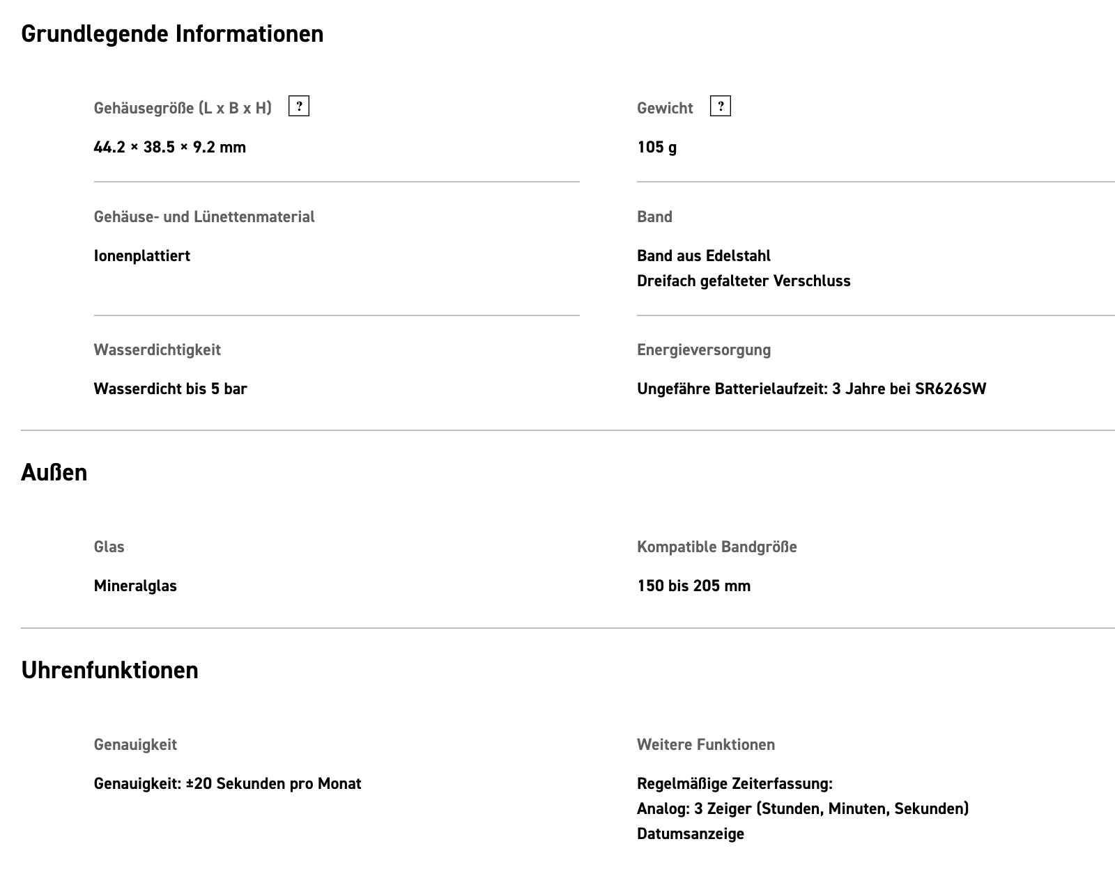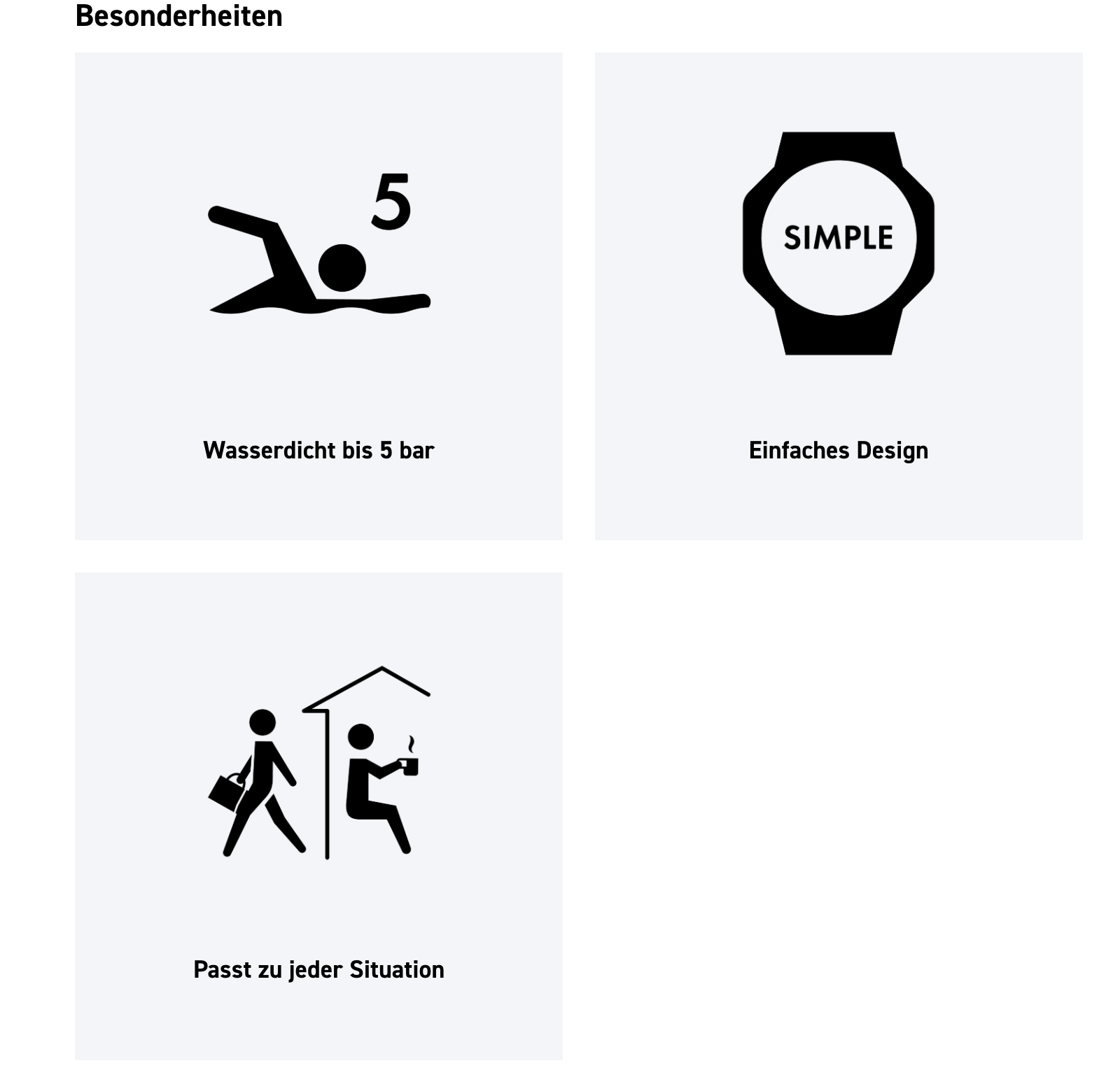 • Datumsanzeige • Wasserdicht bis 5 bar • Armband aus Edelstahl • Einfaches, benutzerfreundliches Design