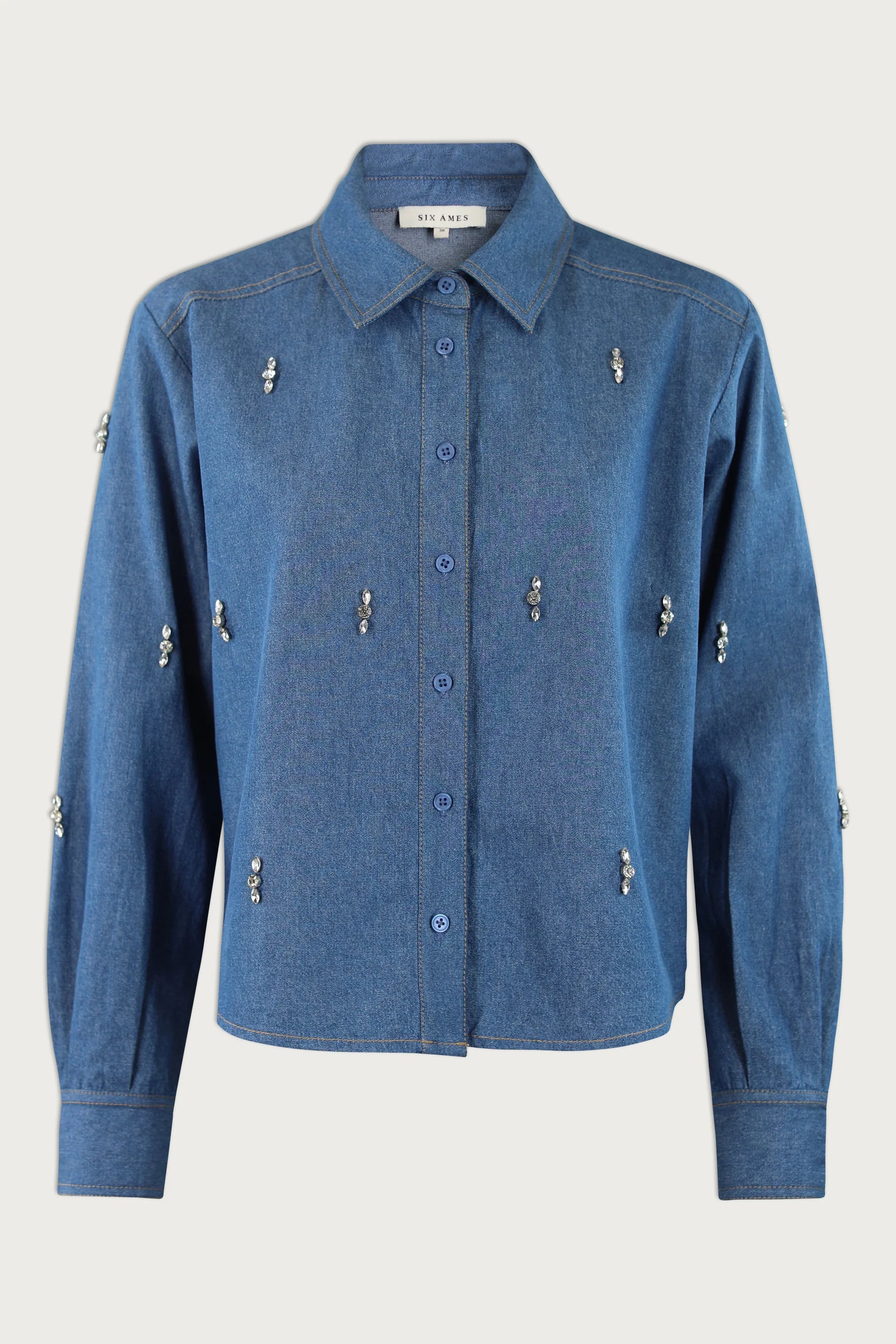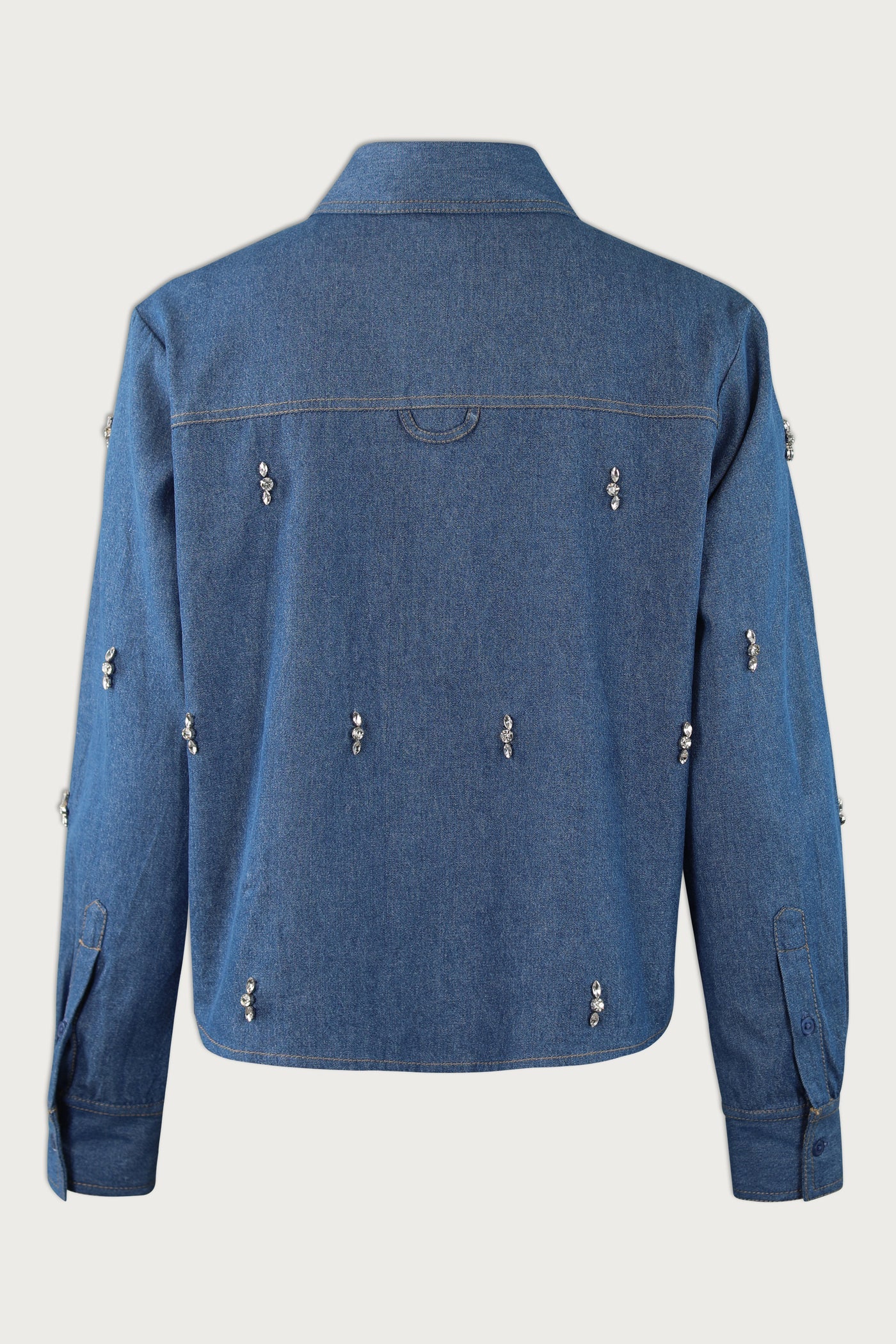 Jackia ist ein locker geschnittenes Hemd aus 100 % Baumwoll-Denim. Es ist auf der Vorderseite mit Strasssteinen verziert, die einem zeitlosen Design einen dezenten Schimmer verleihen.