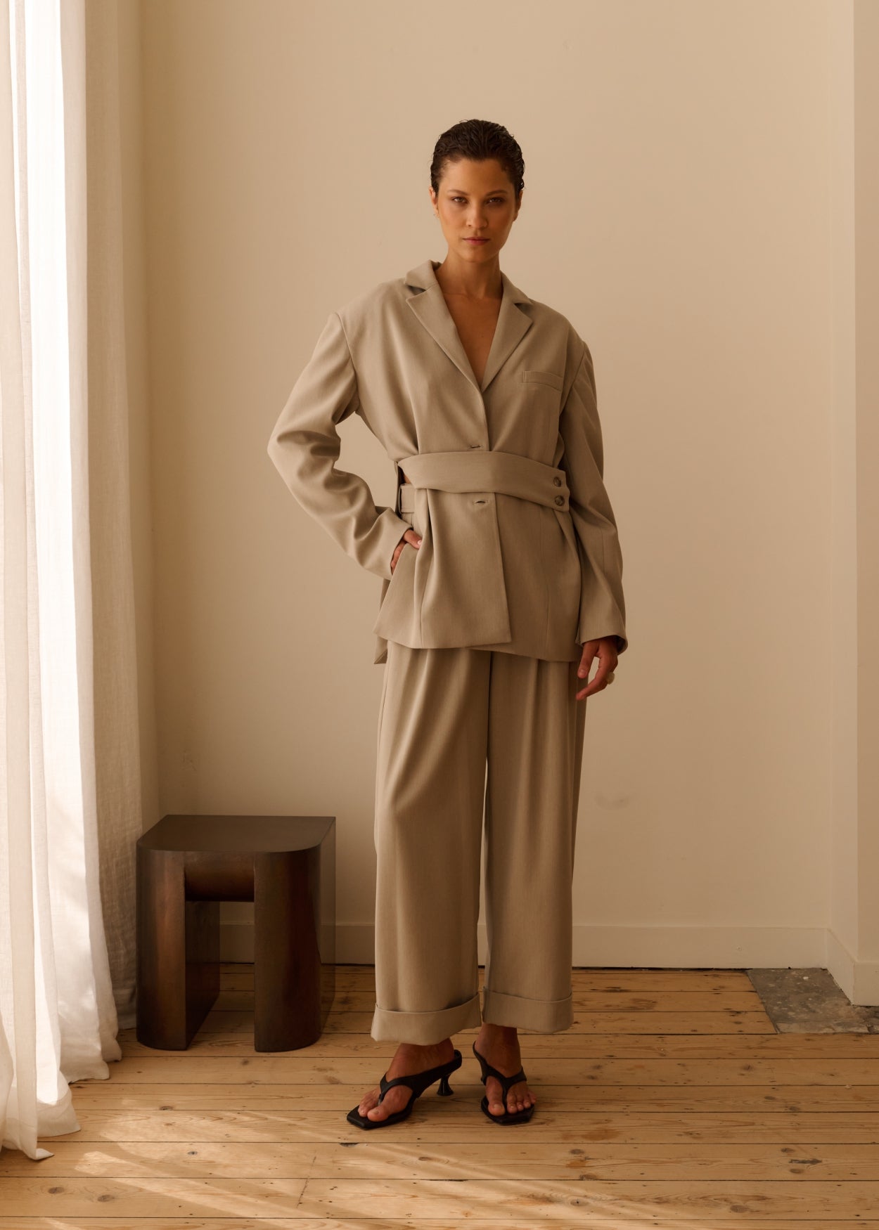 Eine taillierte, verkürzte Hose mit raffinierten Falten und einer klaren, modernen Silhouette. Der Bund ist mit einem eleganten Gürtelverschluss versehen, der dem Look eine edle Note verleiht. Gefertigt aus einer geschmeidigen Mischung aus Viskose, Strukturfasern und einem Hauch Stretch, bietet der Stoff hohen Tragekomfort, einen fließenden Fall und ein anspruchsvolles Finish.