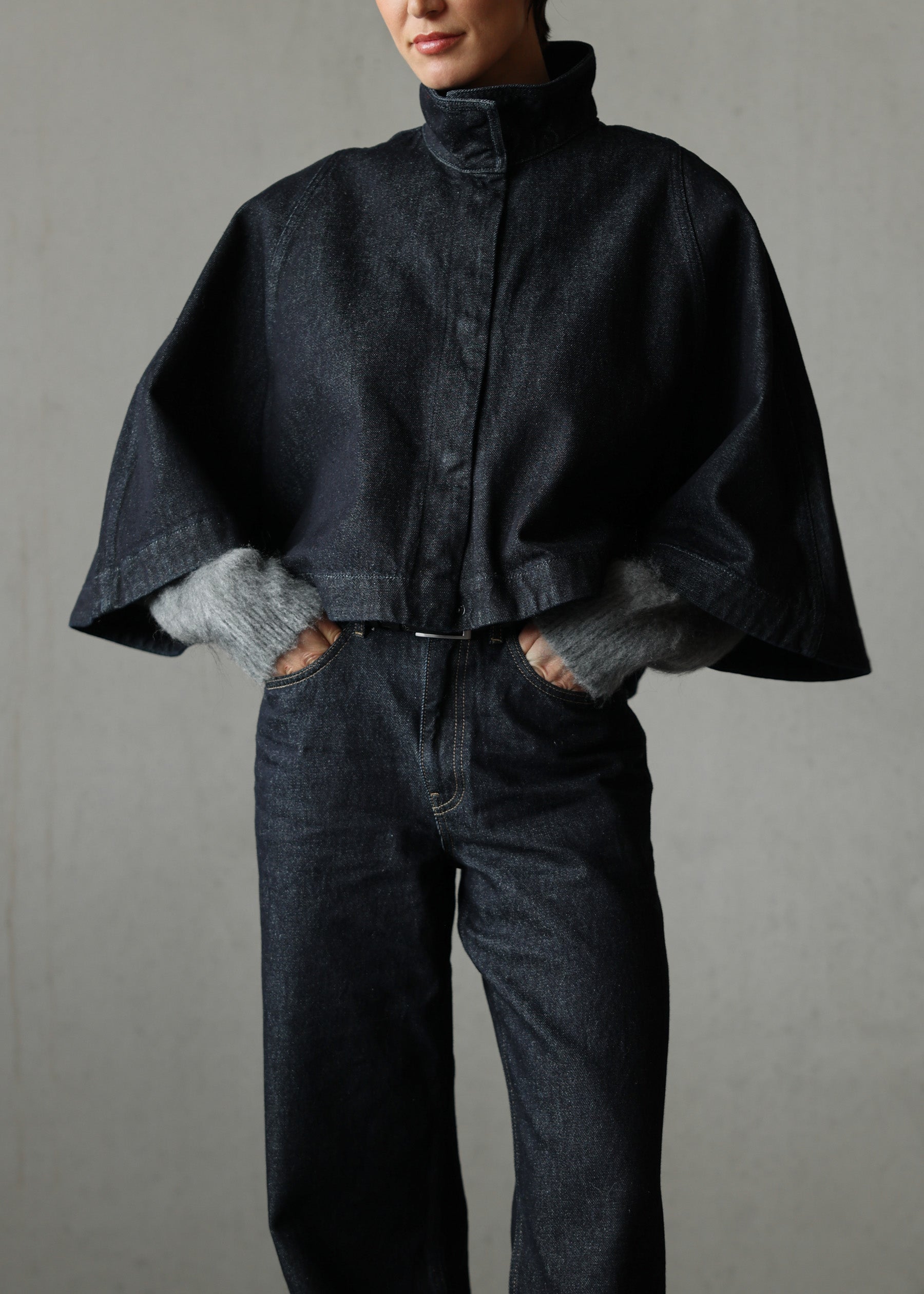 Ein auffälliges Oberbekleidungsstück mit moderner Silhouette. Diese Jeans-Ponchojacke mit strukturiertem Stehkragen und Druckknopfverschluss sorgt für ein klares, minimalistisches Finish. Kombiniere es mit Jeans für ein cooles Denim-Set. Pflege