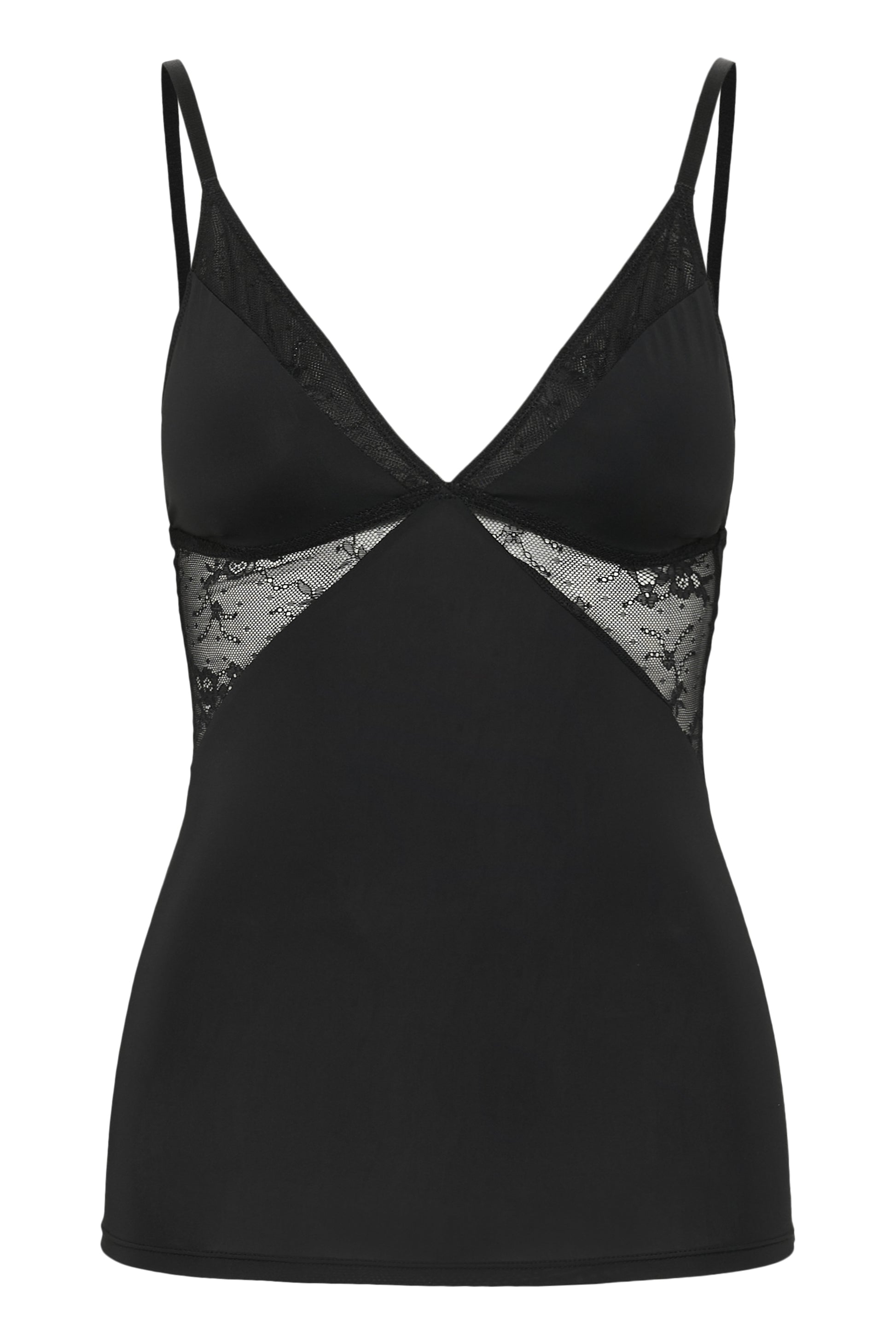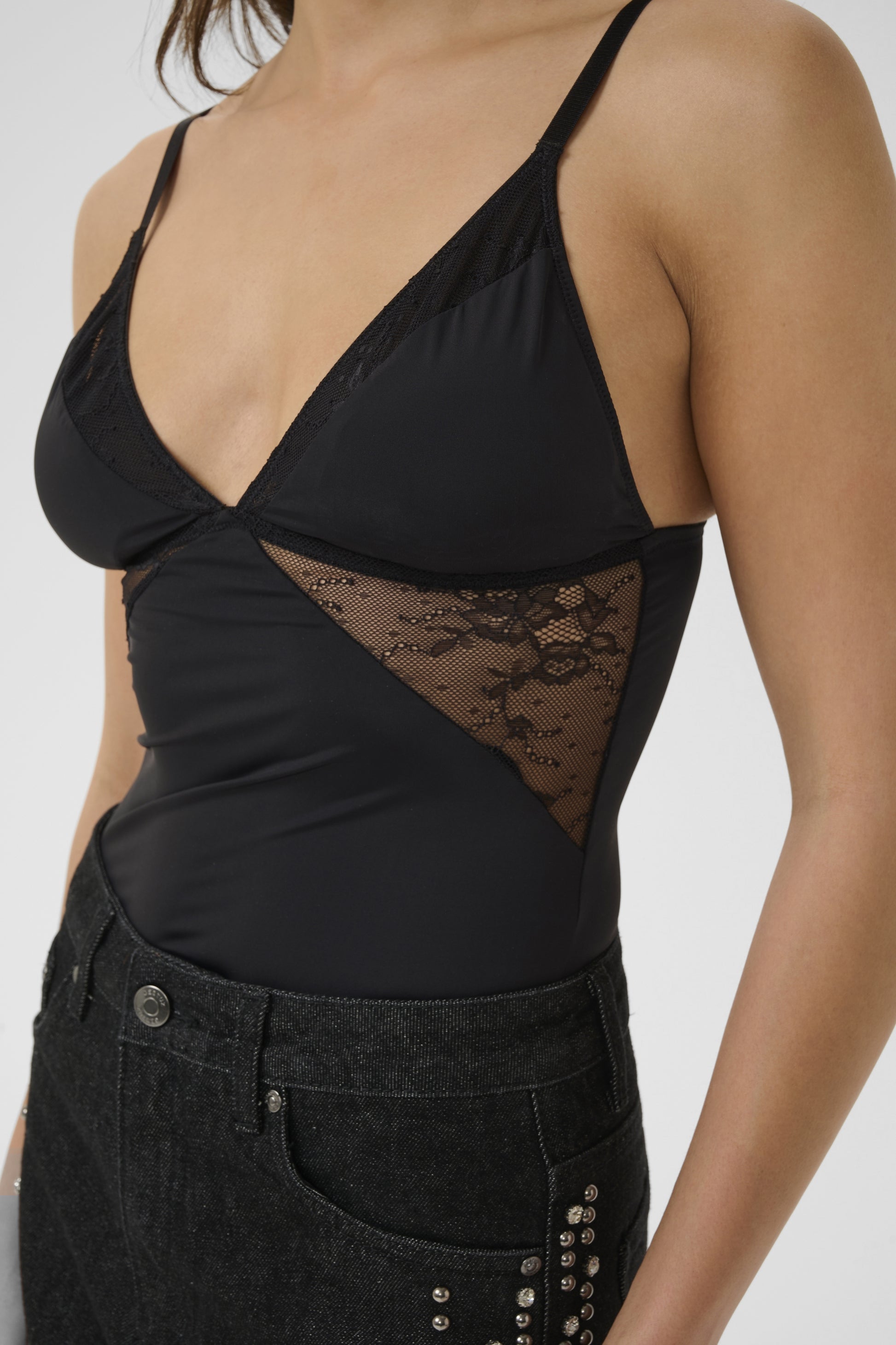Figurbetontes Top von Gestuz mit tiefem V-Ausschnitt und verstellbaren, schmalen Trägern. Aus glattem, elastischem Material für eine schlanke Silhouette und hohen Tragekomfort. Seitliche Lace Spitzeneinsätze