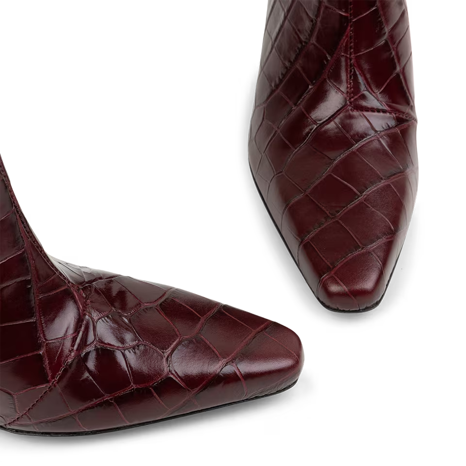 Eine Stiefelette ist die perfekte Wahl für diese Saison, und das Modell Estime in Mulberry Red ist eine großartige Option. Diese elegante Stiefelette ist aus zertifiziertem, geprägtem Rindsleder mit Krokodilmuster und glänzendem Finish. Er ist spitz zulaufend und hat einen schrägen, eleganten kurzen Absatz.