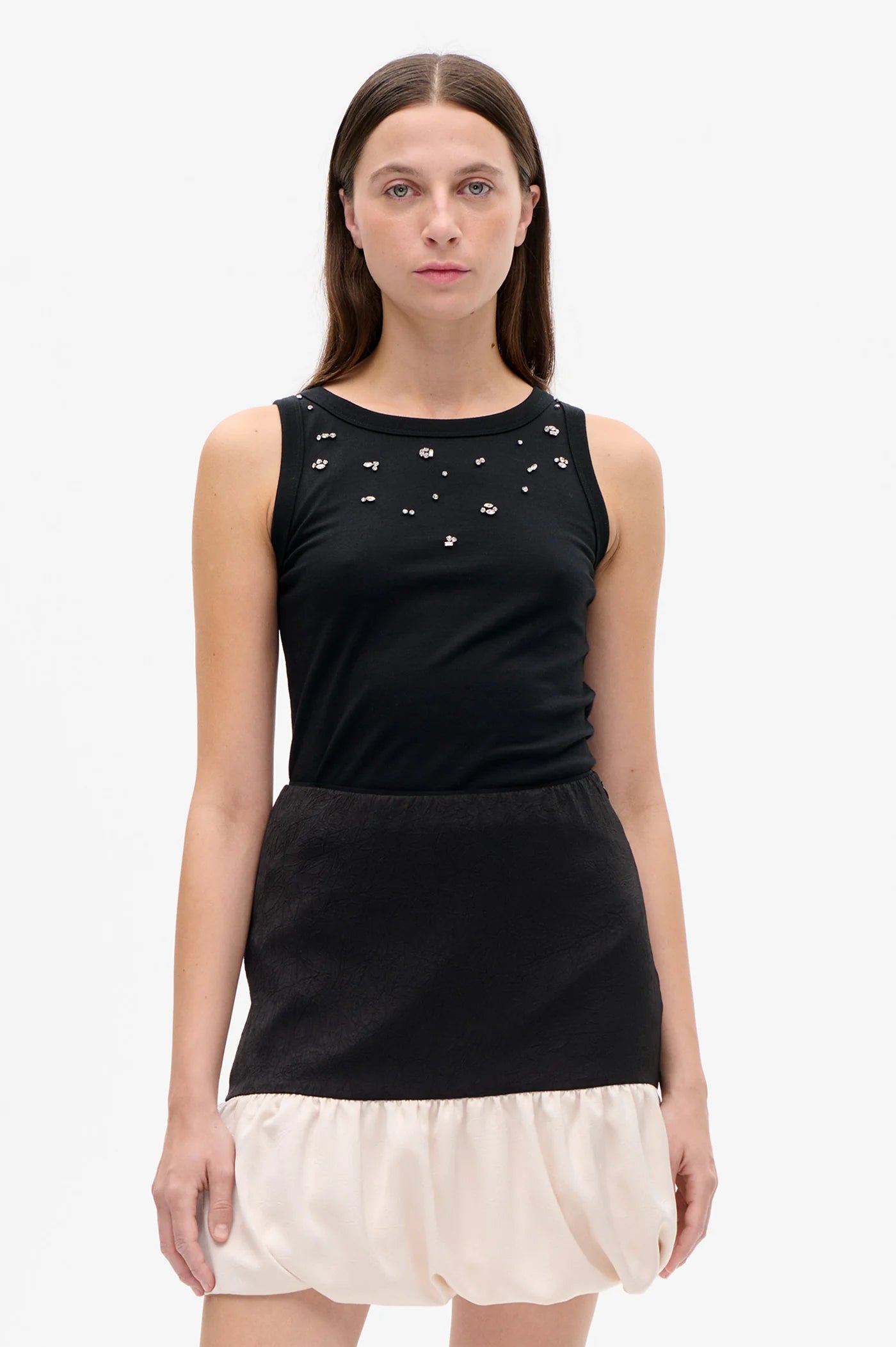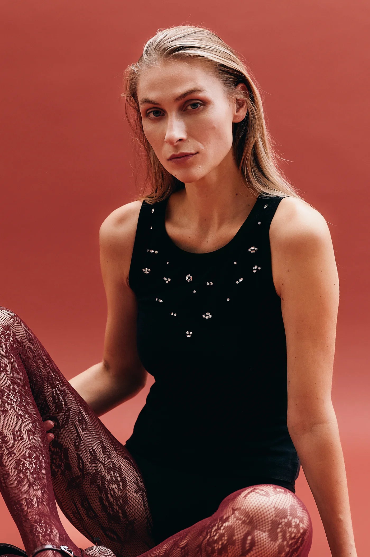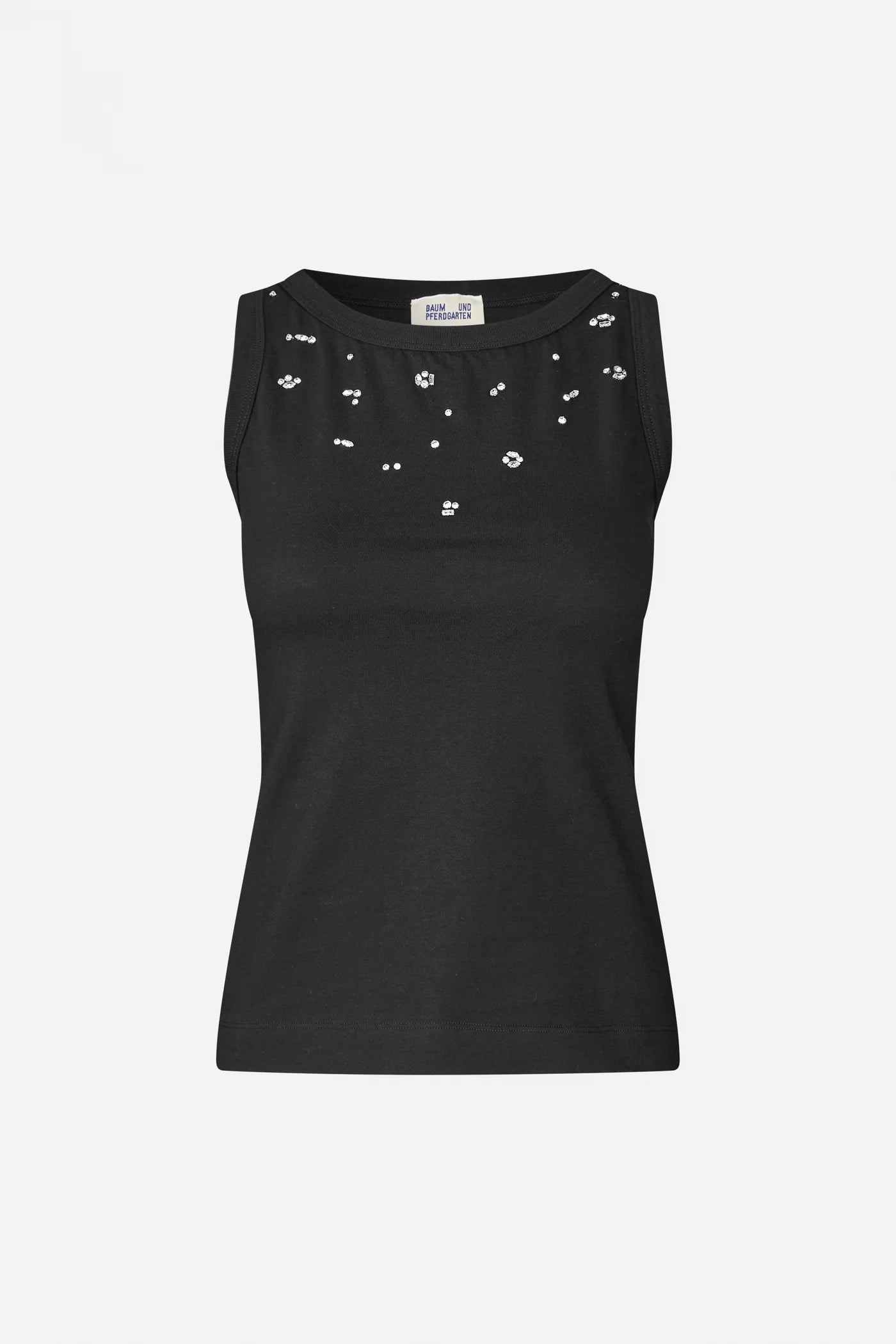 Das Top JolineBP ist ein zeitloses Kleidungsstück mit Strassdetails auf der Brust, die für genau den richtigen Glanz sorgen. Das ärmellose Oberteil hat eine taillierte Tanktop-Optik mit einem Bootsausschnitt für einen modernen Touch.