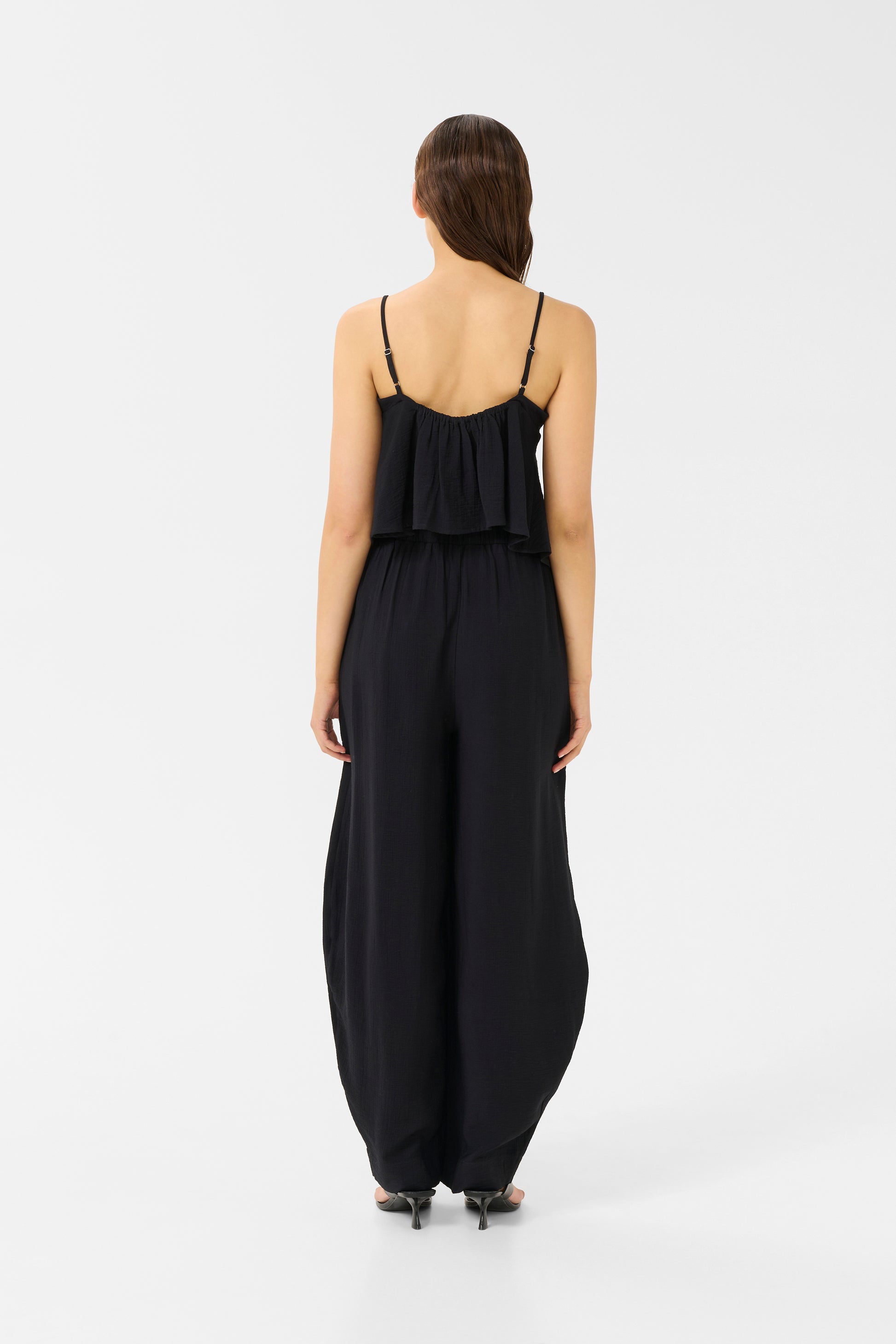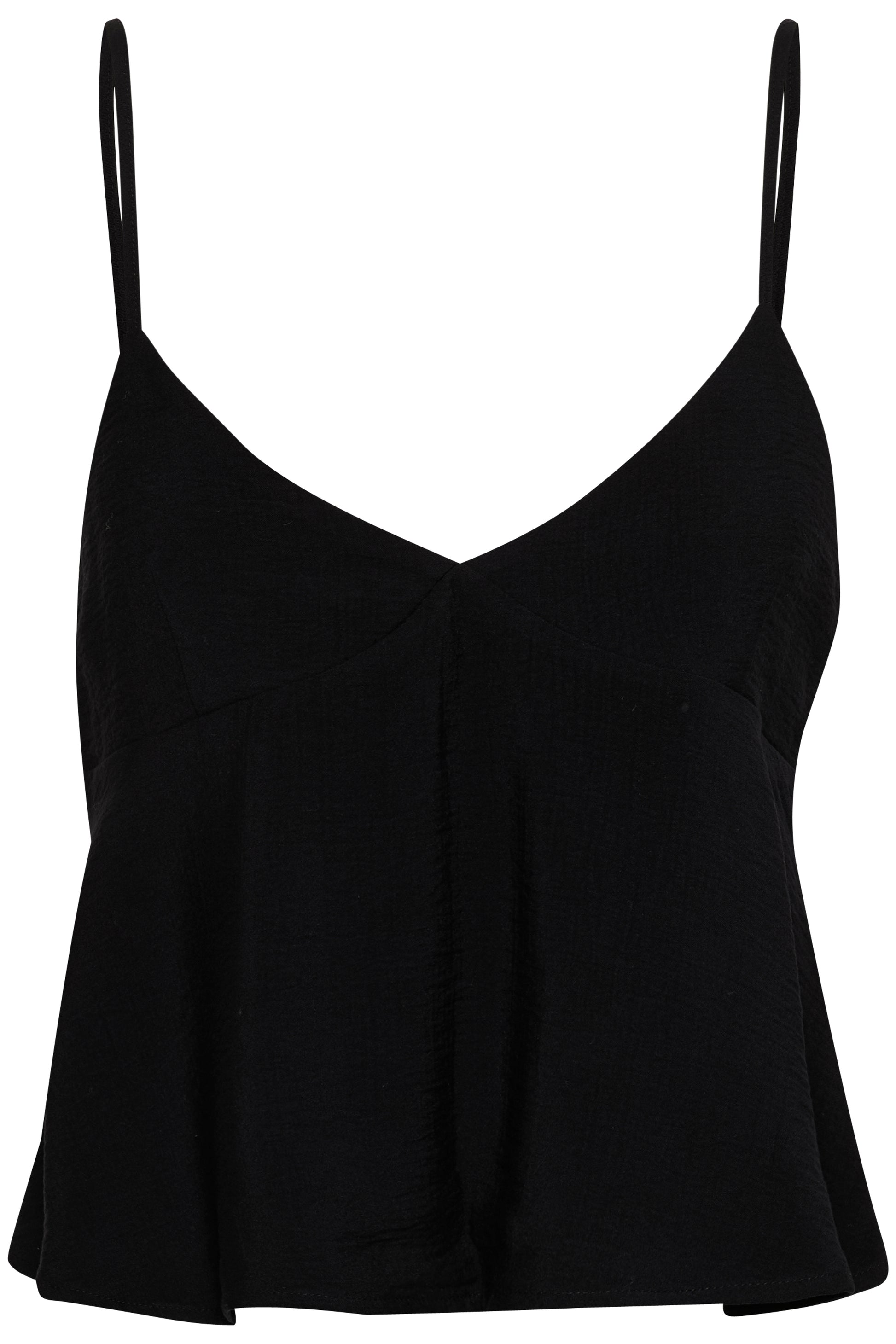 Ärmelloses Top mit ausgestelltem Saum und Spaghettiträgern. V-Ausschnitt und lockere Passform für eine luftige Silhouette. Aus leicht strukturiertem Material für den Alltag gefertigt. Das Model ist 176 cm groß und trägt Größe S/36.
