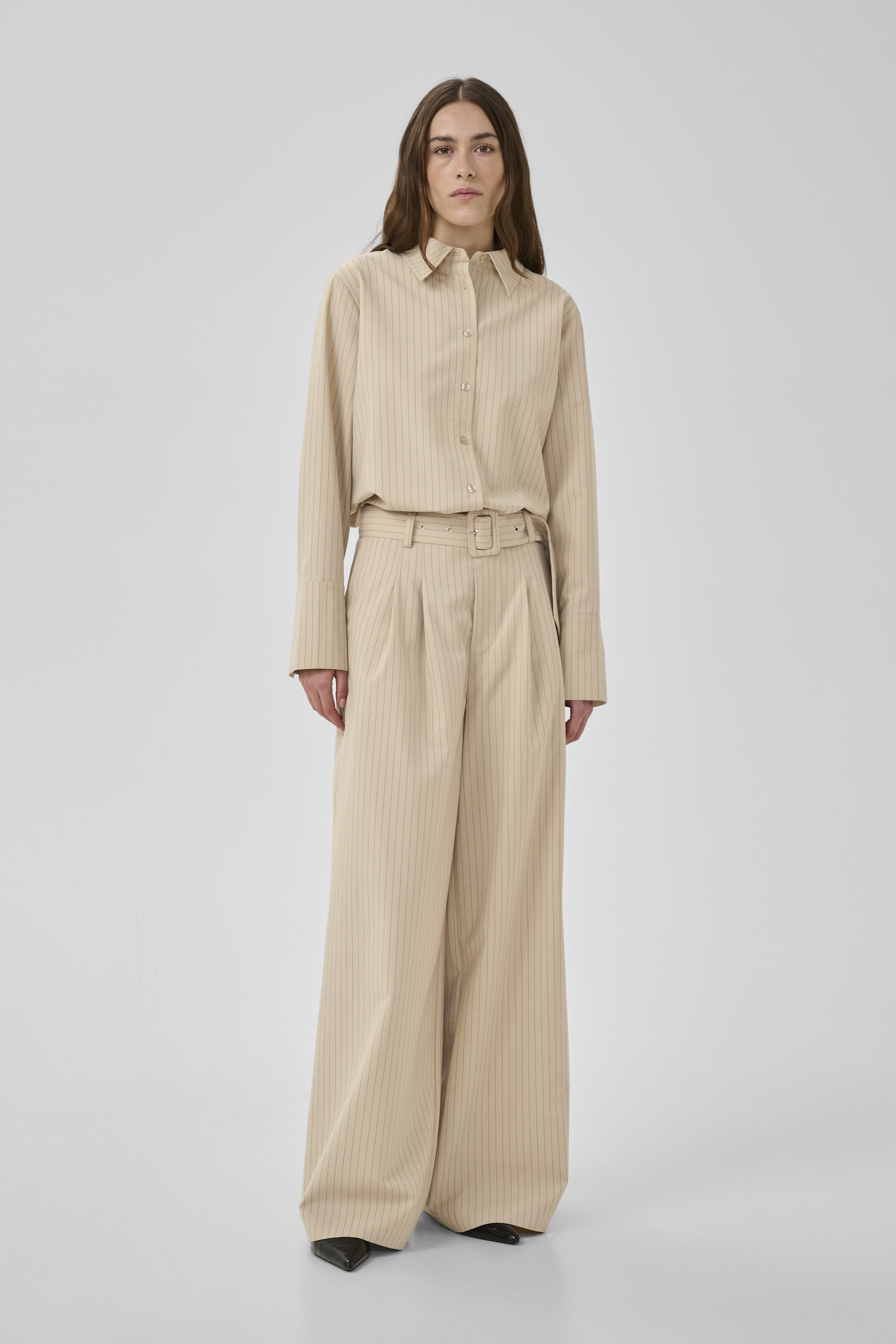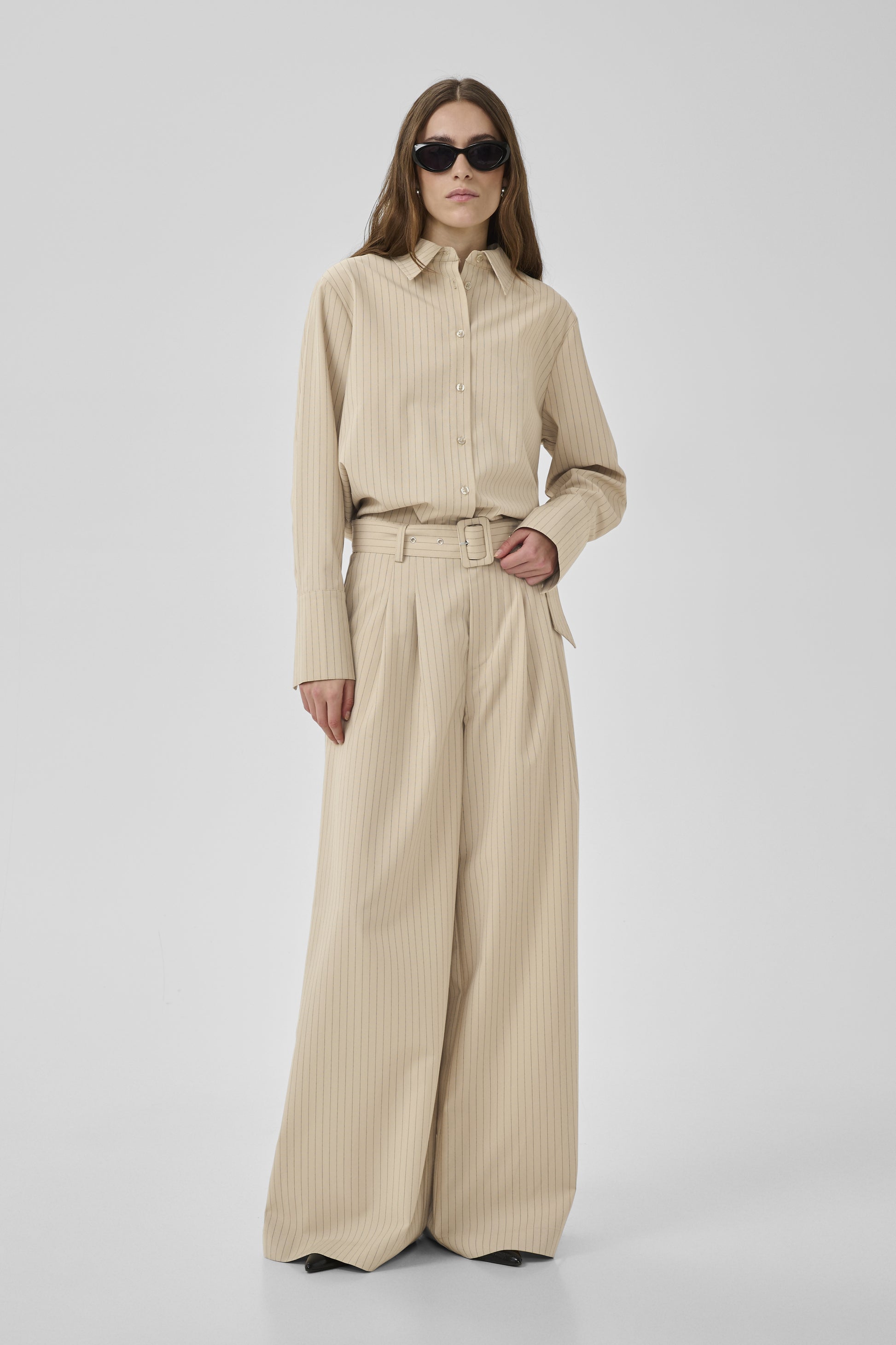 Wide-Leg Damenhosen mit bequemer Passform und elegantem Look. Hoher Bund, Falten und verstellbarer Gürtel bieten Komfort für Büro und Alltag.